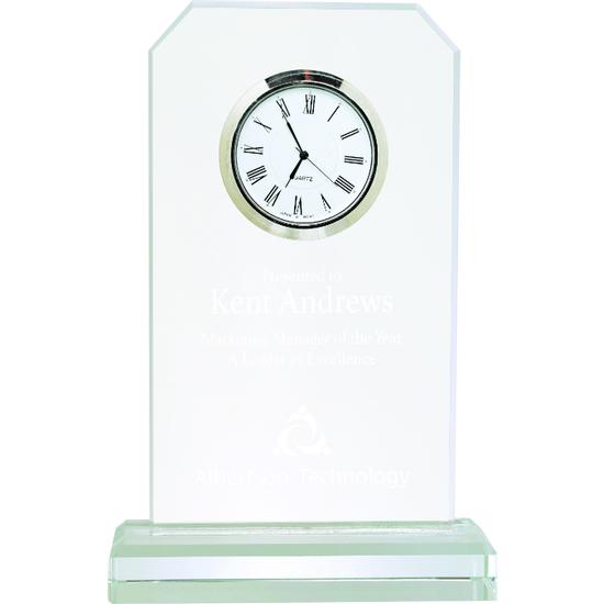 Length:    4 7/8"        Height:    7 1/2"        Width:    1 3/4"        Thickness:    3/8"        Overall Size:    4 7/8"(L) x 7 1/2"(H) x 1 3/4"(W)        Maximum Personalization Area:    3 7/8"(L) X 3 3/4"(H)        Base Dimensions:    4 7/8"(L) x 5/8"(H) x 1 3/4"(W)        Color:    Clear        Lasered Color:    Frosted        Sand Carved Color:    Frosted        Material:    Glass        Gender:    Neutral        Battery Size:    377        Number of Batteries Required:    1        Miscellaneous Dimensions:    Glass only: 3 7/8"(L) x 6 5/8"(H) x3/8" thick            Misc. Notes    - Clock face: 1 5/8" diameter    - Clock face ring: 2 1/8" diameter    - Clock is removable.    - A clear rubber band around the back side of the clock keeps it in place.      WEIGHT: 2.27 LB