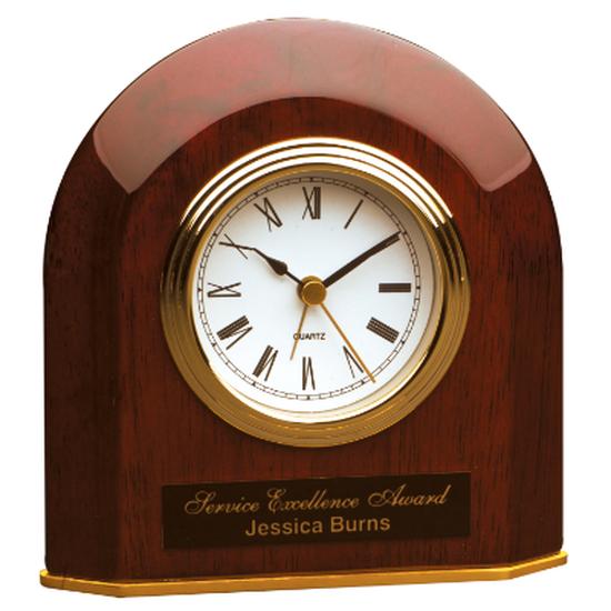 Length:    5 1/2"        Height:    5 1/4"        Width:    n/a"        Thickness:    n/a        Overall Size:    5 1/2"(L) x 5 1/4"(H)        Maximum Personalization Area:    3"(L) x 5/8"(H)        Color:    Rosewood/Gold        Lasered Color:    Can color fill        Material:    Wood/Metal        Gender:    Neutral        Battery Size:    AA        Number of Batteries Required:    1        Miscellaneous Dimensions:    Clock: 3" diameter            Misc. Notes    - Replacement clock works available FOB Sioux Falls.    - Has an alarm clock.      WEIGHT: 0.825 LB