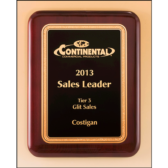 This beautiful Airflyte Premium Rosewood Piano Finish Plaque features a black textured plate with a gold Florentine Border. This elegant plaque is one that definately shows ultimate recognition and appreciation of excellence.