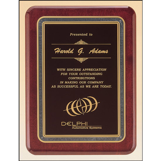This beautiful high gloss piano finish rosewood plaque features a black LaserFX engraving plate with a gold Florentine design. Personalized to create a unique award,this elegant plaque is a perfect recognition of exellence and achievement.
