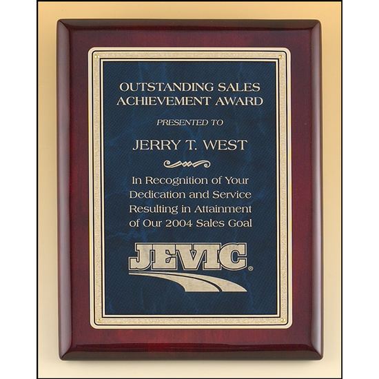 This beautiful high gloss piano finish rosewood plaque features a Sapphire marble plate with a gold Florentine design. Personalized to create a unique award,this elegant plaque is a perfect recognition of exellence and achievement.