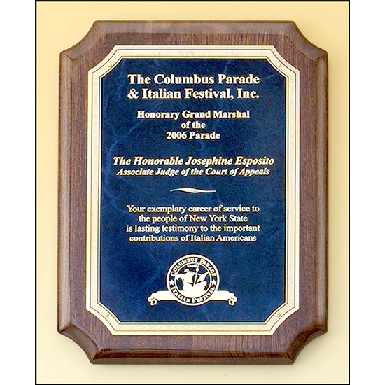 This beautiful Airflyte Premium Walnut Piano Finish Plaque features a blue textured LaserFX plate with a gold Florentine border. This elegant award can be personalized for your event to acknowledge and honor achievement or milestones reached.