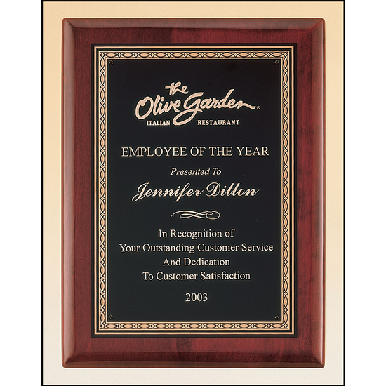 This beautiful Airflyte Premium Rosewood Piano Finish Plaque features a black laserable brass Florentine gold border plate. This elegant plaque is onethat shows ultimate recognition and appreciation of excellence.