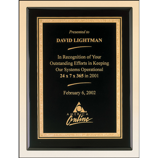 This beautiful Airflyte Premium black piano finish plaque features a black LaserFX plate with a gold Florentine border. This elegant award plaque can be personalized for your event to acknowledge and honor achievement or milestones reached.