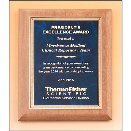 This stunning Natural Alder Wood plaque is embellished with a sapphire marble, gold Florentine Bordered LaserFX Plate. Personalized for your event this plaque makes an elegant award, perfect for the recognition of excellence and milestones achieved.