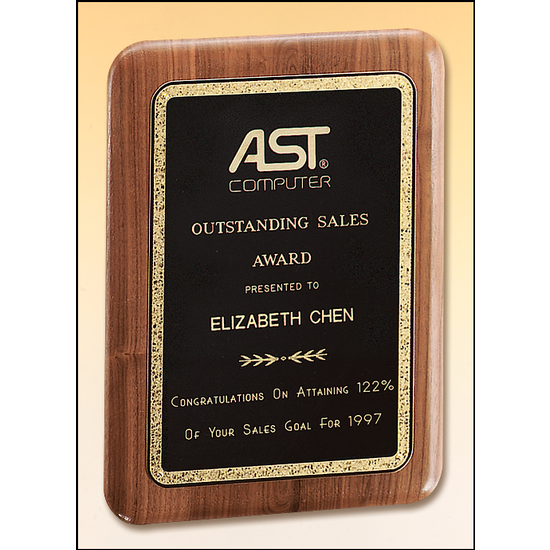 This American Walnut round corner plaque features a black LaserFX plate with a wide gold Florentine border plate. Keyholed for verticle or horizontal hanging, this American made traditional plaque award is a timeless recognition of achievement or milestones reached.