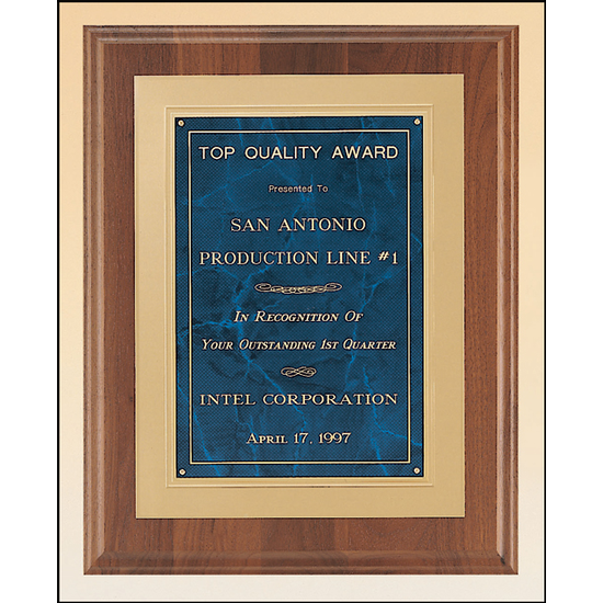 This stunning American Walnut step edge plaque is embellished with a sapphire marble gold framed LaserFX plate. Personalized for your event, this plaque has an elegant, prestigious look for an award that's a perfect for the recognition of achievement or milestones reached.