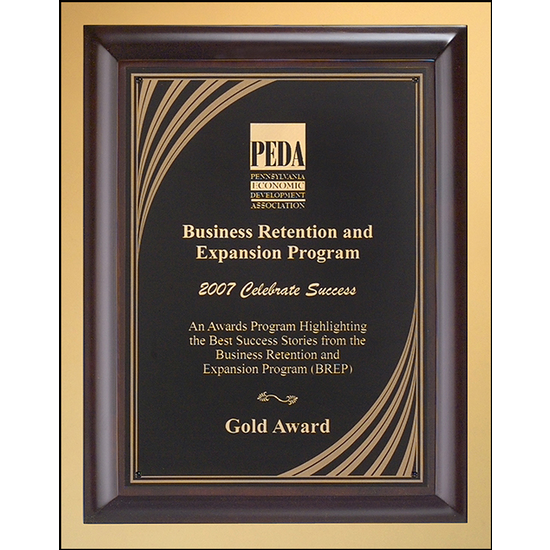 This Cherry finish plaque is hand rubbed for a furniture quality finish. Embellished with a gold Cascading Swirl design laserable black brass plate, this is an elegant, prestitious looking award for the recognition of excellence.