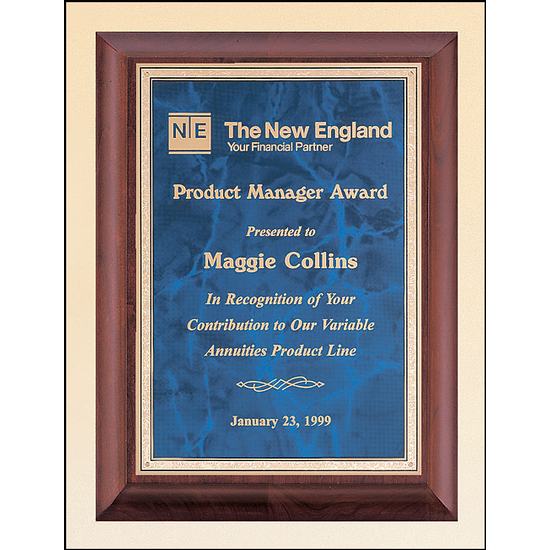 This Cherry finish plaque is hand rubbed for a furniture quality finish. Embellished with a gold border sapphire marble LaserFX plate, this is an elegent, prestitious looking award for the recognition of excellence.