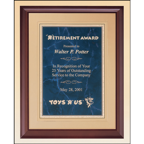 This Cherry finish plaque is hand rubbed for a furniture quality finish. Embellished with a sapphire marble LaserFX plate on a gold embossed back plate,this is an elegant, prestigious looking award for the recognition of excellence.