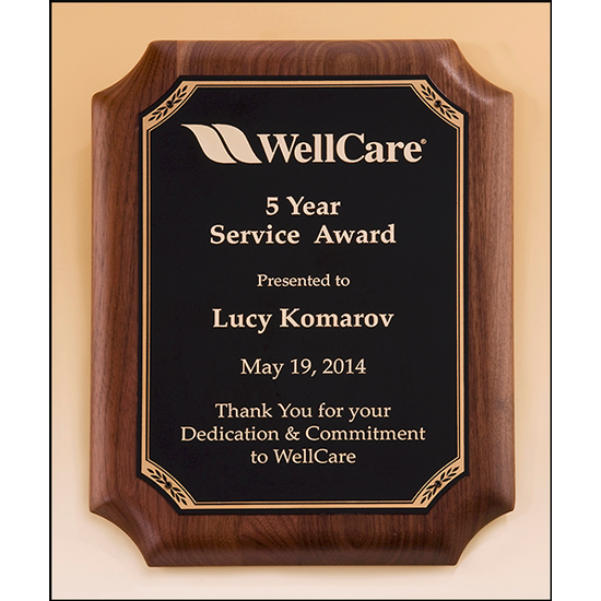 This American Walnut round corner plaque features a black LaserFX gold border plate with the same profile. Keyholed on the back for verticle or horizotal hanging, this American made traditional plaque award is a timeless recognition of achievement or milestones reached.