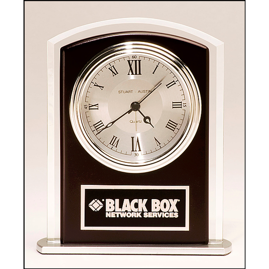 Airflyte Collection - Beveled glass with wood accent, silver bezel and dial. Three hand movement. Gold dial, three hand movement. Clocks supplied with quartz movements. Solid brass engraving plate. Individually boxed. Batteries Included.