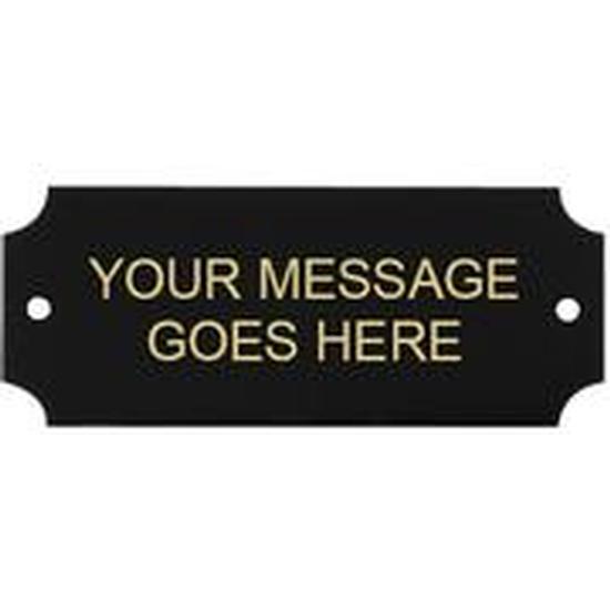 Product Details    Length 2 1/2"    Height 1"    Overall Size 2 1/2"(L) x 1"(H) x .016    Color Black    Lasered Color Gold    Sand Carved Color Gold    Material Brass    Gender Neutral    Protective Coating Plastic    Color Engraves To Gold