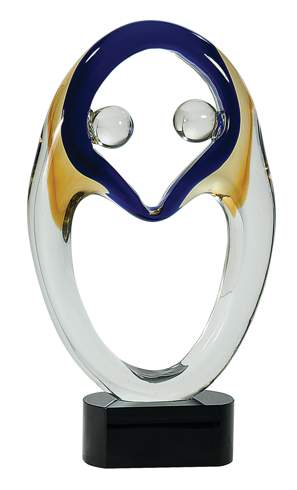 Artistically inspired hand blown glass sculpture. Each piece is uniquely different, colors and sizes will vary slightly. Premier Art Glass is mounted on a black glass base. Packaged individually in a lined gift box. Recognize or honor in a unique way!