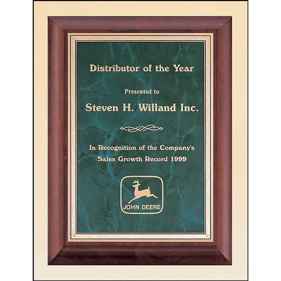 This Cherry finish plaque is hand rubbed for a furniture quality finish. Embellished with a gold border emerald marble LaserFX plate, this is an elegant, prestitious looking award for the recognition of excellence.