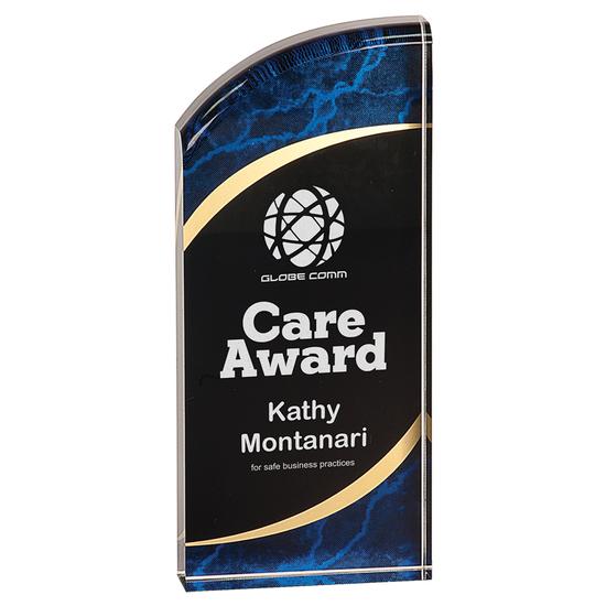 Premier Acrylic is the ultimate way to recognize the highest achievement. Rounded Marbleized Acrylics are 1 inch thick and self-standing. They come in 3 different sizes and 4 colors- Green Marble, Red Marble, Blue Marble and Stars & Stripes. They are easily customizable by either rotary engraving or laser engraving.