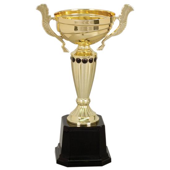 Short Description:    13" Gold Completed Metal Cup Trophy on Plastic Base        Length:    8 5/8"        Height:    13"        Width:    5 1/2"        Thickness:    n/a        Overall Size:    8 5/8"(L) x 13"(H) x 5 1/2"(W)        Base Dimensions:    4 1/4"(L) x 3"(H) x 4 1/4"(W)        Base Personalization Area:    2 3/8"(L) x 2 1/8"(H)        Color:    Gold/Black        Material:    Iron/Plastic        Gender:    Neutral        Number of Batteries Required:    n/a        Miscellaneous Dimensions:    Cup: 5 1/2" diameter            Misc. Notes    Cup and handles are metal. Riser, stem and base are plastic.    Cup is attached to base with a hexnut. Black dots around stem are painted on.    Cup from base to top of handles: 10"(H)    Top of base: 3 1/4" x 3 1/4"    Lid sold separately: part number CML4G    Diamond Drag Engravable:    No        Burnishable:    No        Rotary Engravable:    No        Laserable:    No        Sublimatable:    No        Sand Carvable:    No        Front Engravable:    No        Reverse Engravable:    No        Indoor Use Only:    Yes        Double Sided:    Yes        Self Standing:    Yes        Stands Vertical:    Yes        Has Easel Back:    No        Includes Sawtooth For Hanging:    No        Back is KeyHoled:    No        Self Standing:    Yes        Includes Base:    Yes        Base Attached:    Yes        Includes Pins:    No        Includes Batteries:    No        Lid Available:    Yes        Includes Lid:    No        Lid Sold Seperately:    Yes        Individually Packaged:    Yes