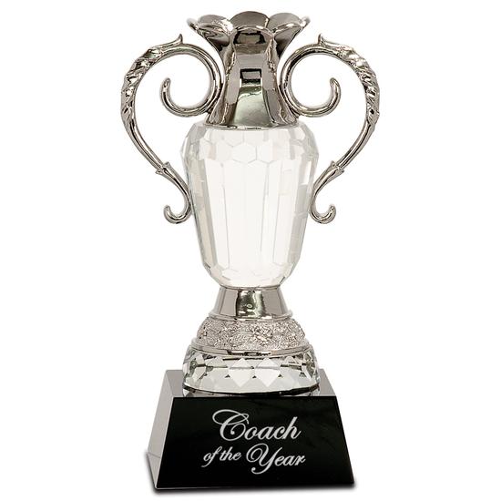 Our Premier Cup Crystal is handmade and may vary slightly in size. Clear optic crystal cup is attached to the black crystal base. Metal handles and decorative parts add an exquisite touch. Packaged individually in a lined gift box. Make this crystal award the perfect showpiece to honor excellence and appreciation!